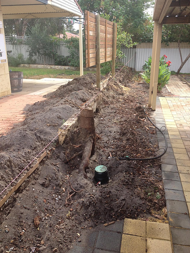 Above: Prior to installing the large limestone blocks, an old asbestos fence was removed as well as some limestone garden edging. A tree stump had to be removed, and a string line set up to see what else might be in the way. The timber screening put in place further down the fenceline was to add height and privacy for both neighbours, since previously the fence sat lower (not on top of the retaining).